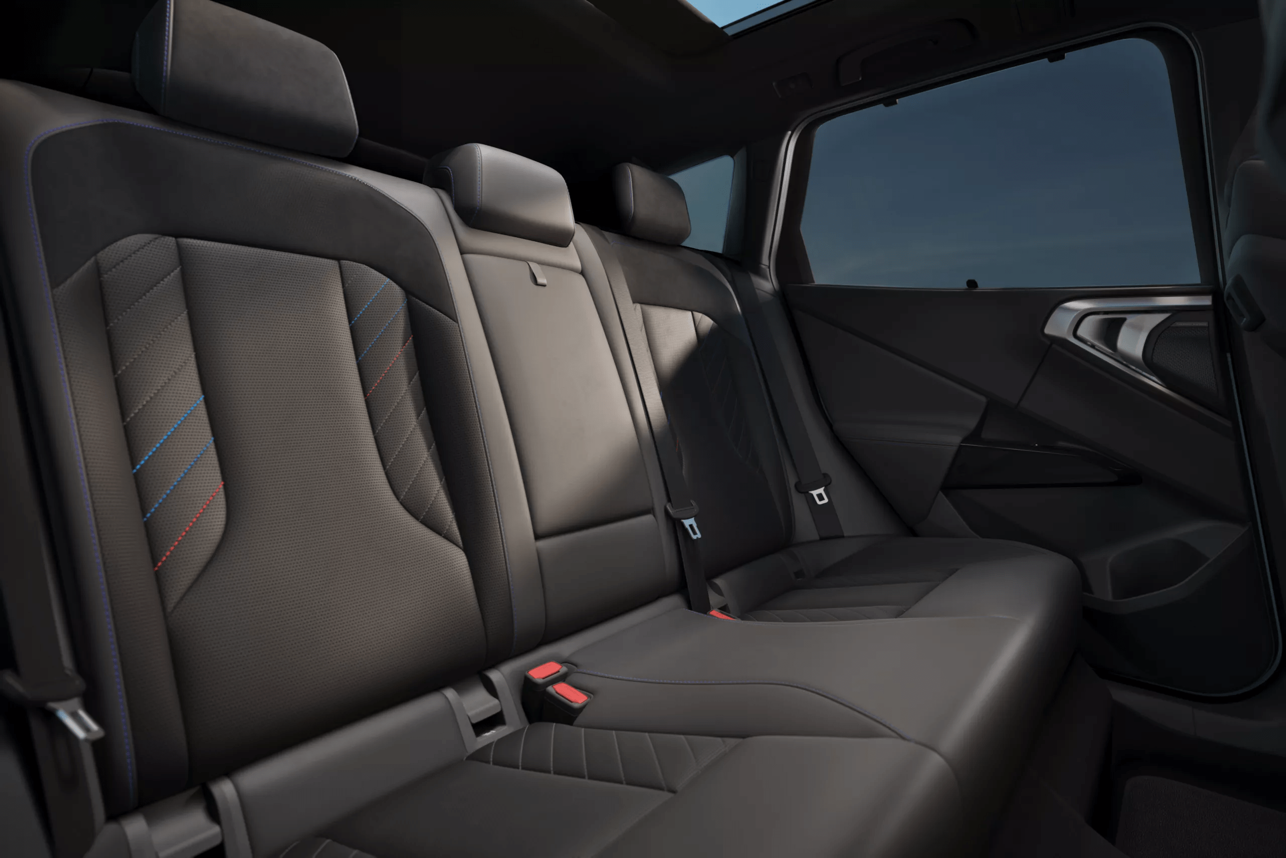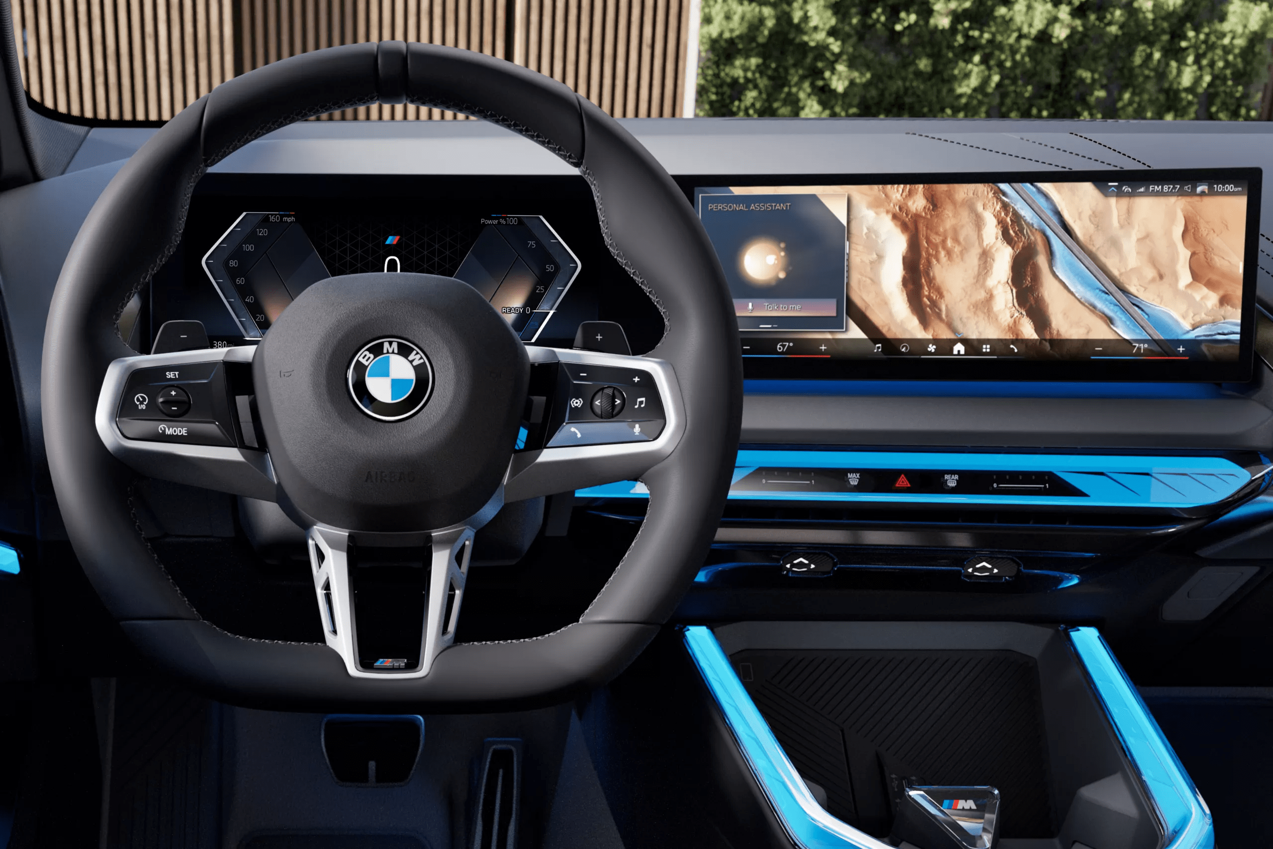 The new BMW Curved Display stretches across the dash in a single sweeping arc, housing both the digital instrument cluster and infotainment screen in one sleek unit. The dashboard is clean and uncluttered, with fewer physical buttons and more customizable touch controls. Ambient lighting lines the dash and doors with configurable colors that can shift based on driving mode or mood.